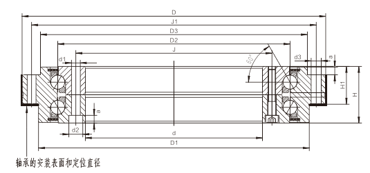 • HKLDF-B系列推力角接触球轴承包括一个整体外圈、两个内圈和两组钢球及保持架组件,接触角为60度。外圈和内圈带有安装孔,方便通过连接螺栓对轴承进行安装固定。轴承自身通过联接螺栓固定,保证安装运输和搬运。